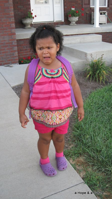 Below: ...or maybe not so calmly. A rough morning. She had enjoyed visiting her classroom, meeting her teacher, packing her backpack, and learning about her new morning routine; but when the rubber hit the road it was a whole lot of crying...all through breakfast, all through dressing, all through brushing teeth, all through everything until I dropped her off...